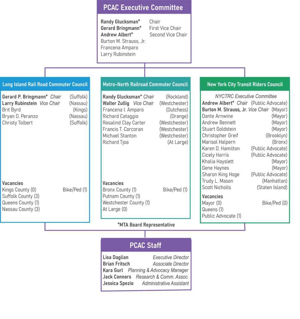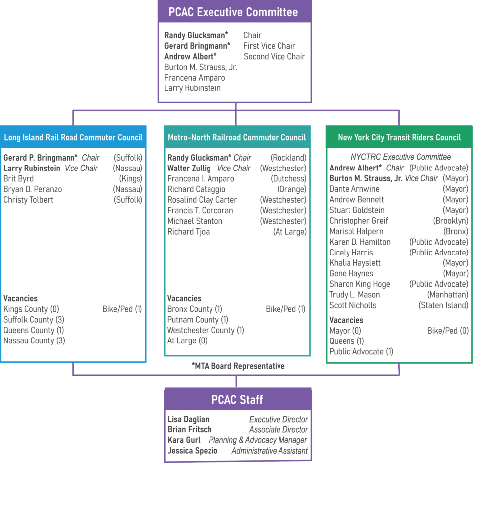The PCAC membership consists of the members of all three Councils. Serving as officers are:Chair: Randy Glucksman (MNRCC) First Vice Chair: Gerard P. Bringmann (LIRRCC) Second Vice Chair: Andrew Albert (NYCTRC)