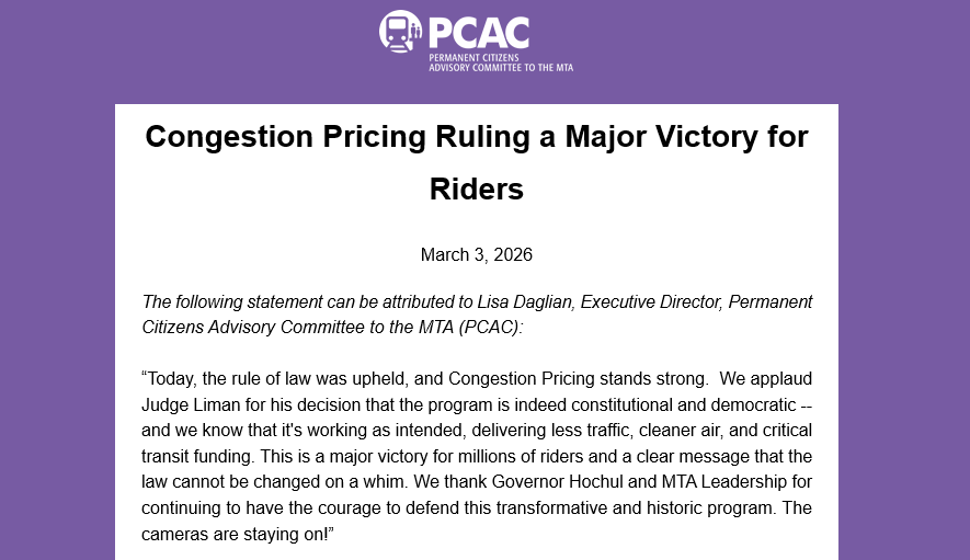 The following statement can be attributed to Lisa Daglian, Executive Director, Permanent Citizens Advisory Committee to the MTA (PCAC):      “Today, the rule of law was upheld, and Congestion Pricing stands strong.  We applaud Judge Liman for his decision that the program is indeed constitutional and democratic — and we know that it’s working as intended, delivering less traffic, cleaner air, and critical transit funding. This is a major victory for millions of riders and a clear message that the law cannot be changed on a whim. We thank Governor Hochul and MTA Leadership for continuing to have the courage to defend this transformative and historic program. The cameras are staying on!”