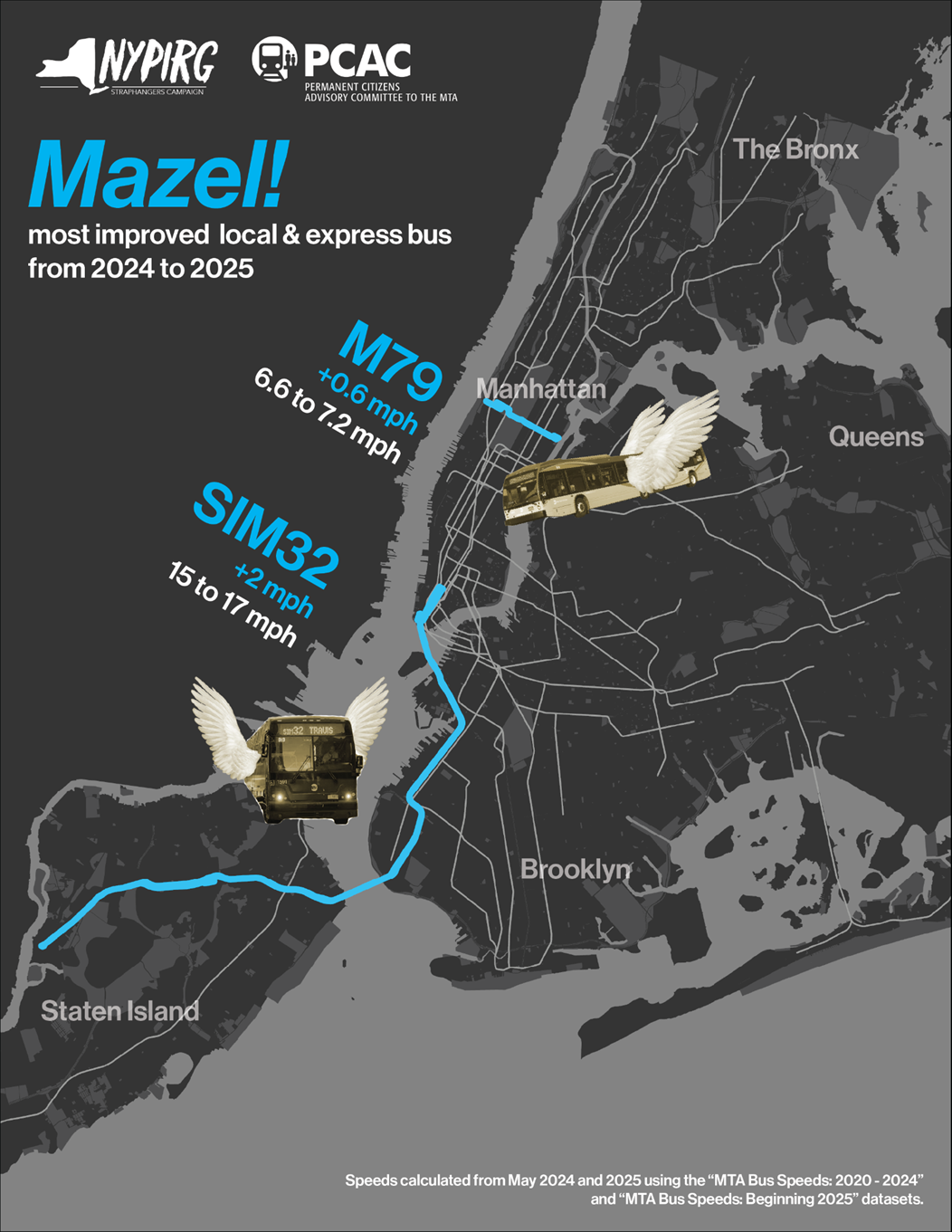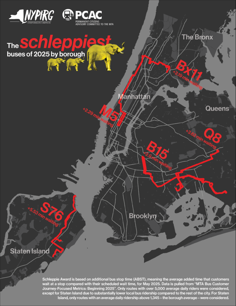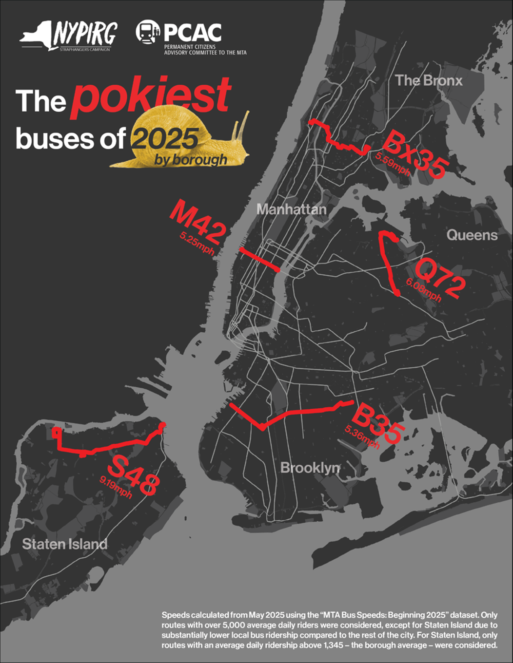 With renewed focus on buses and speeding the trips for the millions of riders who rely on them, the New York Public Interest Research Group (NYPIRG) Straphangers Campaign and Permanent Citizens Advisory Committee to the MTA (PCAC) announced reinvigorated Pokey and Schleppie Awards for poor bus service, and creation of a new category – the Mazel – for most improved.